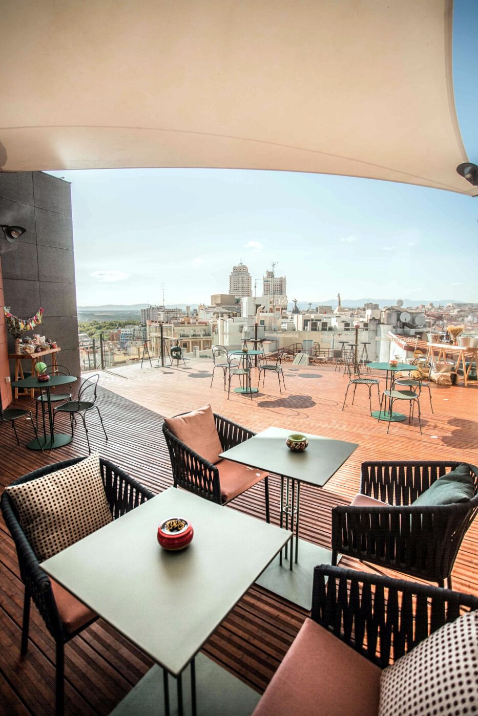 La terraza del hotel cuenta con una de las mejores vistas a la ciudad de Madrid. Un lugar de reunión con un ambiente indiscutible y una infinity pool capaz de sacar la mejor sonrisa de todos los allí presentes.