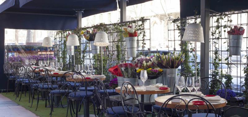 En su terraza, ubicada en plena calle Velázquez, protegida del sol y llena de plantas y coloridas flores, se puede además disfrutar de una amplia oferta de vinos por copas seleccionados por el equipo de sumilleres de Santa Cecilia o tomar un refrescante gin tonic de media tarde.