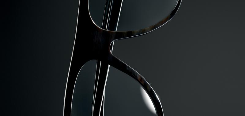 TON N.3 con forma de doble capa, en cuerno marrón oscuro con lentes azules o cuerno marrón claro con lentes en el mismo tono. TOM N.5 es un estilo clásico que se volvió icónico gracias a Colin Firth en "A Single Man". Para la colección Private, este modelo se presenta en cuerno de búfalo negro con lentes verdes o cuerno marrón rayado con lentes en marrón claro.